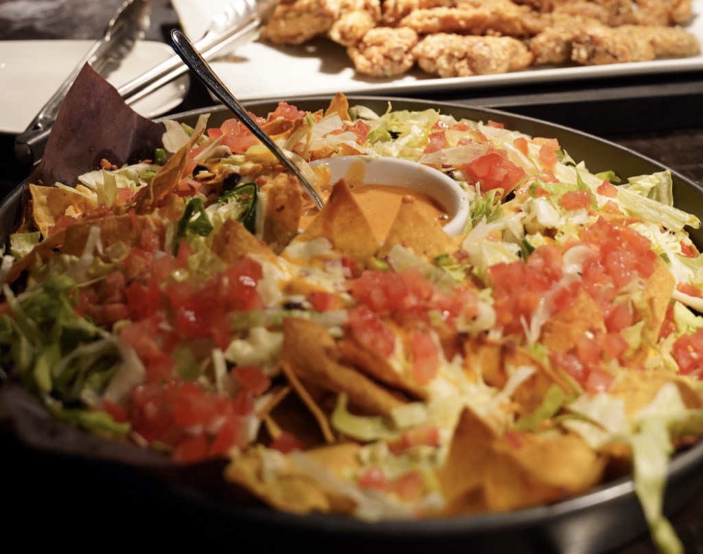 Fried corn tortilla topped with fresh guacamole, sauteed chili lime shrimp, garnished with cilantro and feta.